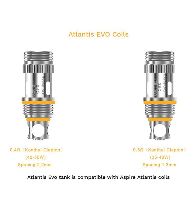 The improved Atlantis EVO sub-ohm tank. Choose between 0.4 ohm and 0.5 ohm Kanthal coils to achieve your preferred taste while using a wide array of E-liquid flavors. 0.4 ohm coils have larger airflow for greater vapor production and balanced flavor. 0.5 ohm coils produce more dense vapor which highlights the flavor. Switch between EVO coils as needed and ensure you are maximizing your vape experience.