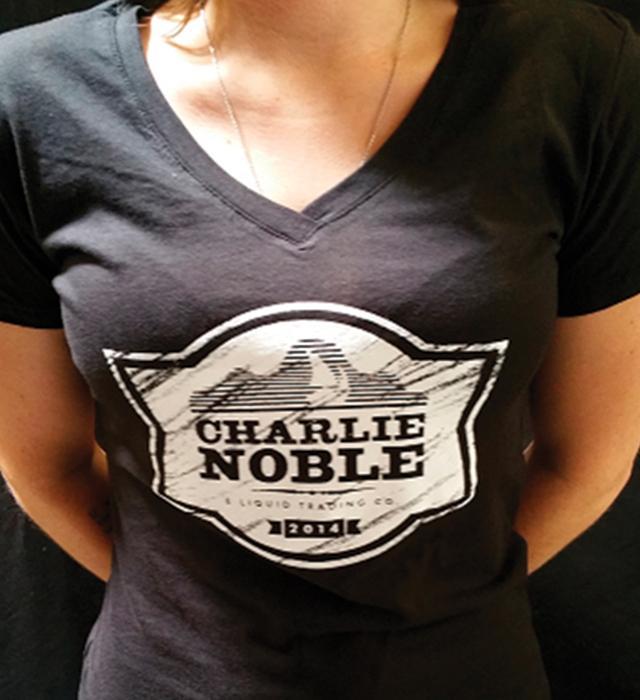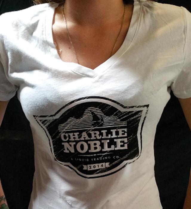 Women's V-Neck T-shirt with the Traditional Charlie Noble logo. Available in White and Black with size options of: Small, Medium or Large.